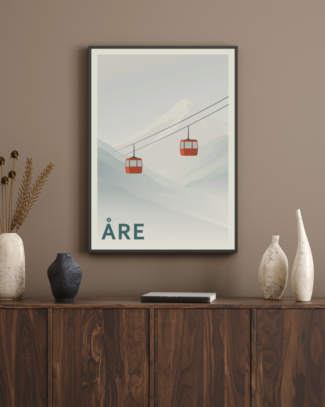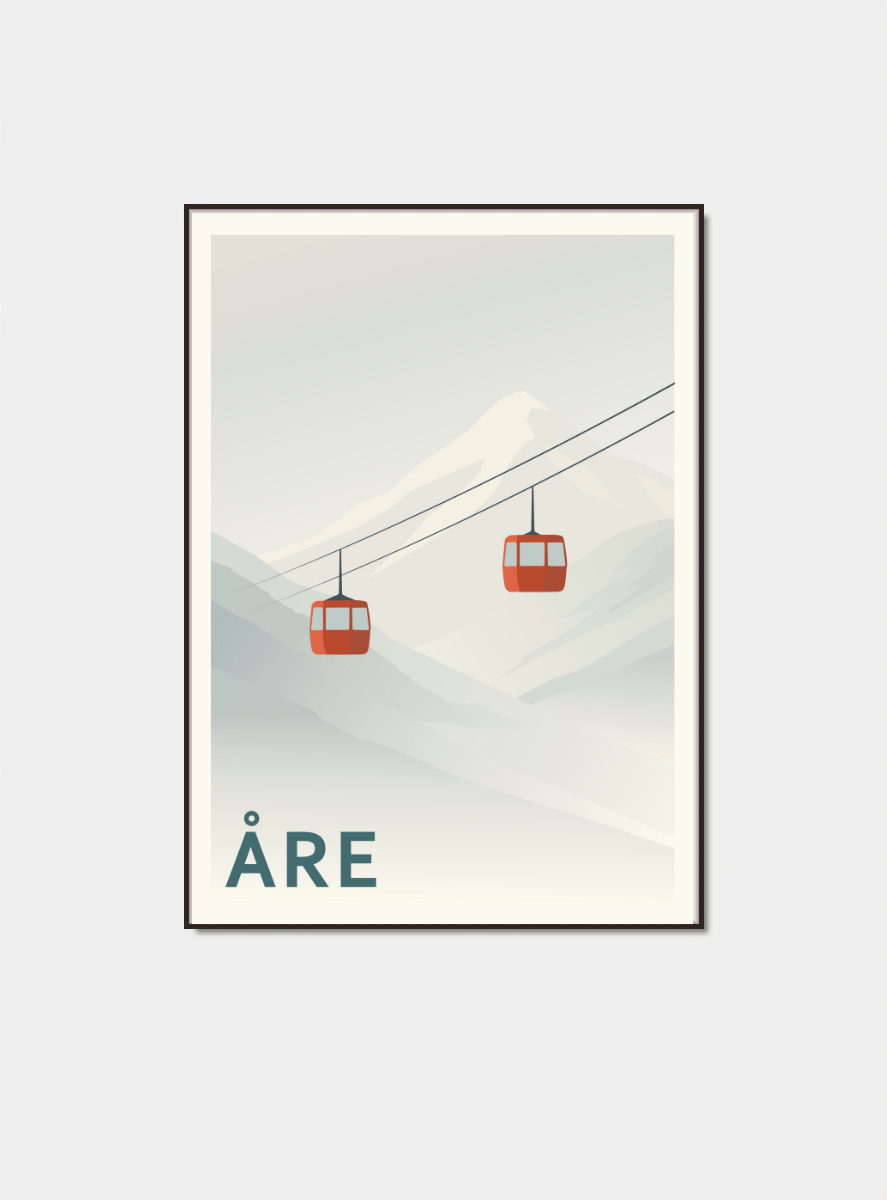 Kabinbanan i Åre, Sveriges enda kabinbana, står i fokus på denna stilrena poster. Den grafiska Åre‑tavlan visar två röda kabiner som svävar över mjuka fjälltoppar och fångar känslan av skidåkning och vandring i fjällmiljö. Med minimalistisk design och dämpade färger blir denna fjällposter en snygg inredningsdetalj i både fjällstuga och hem. En perfekt poster för dig som vill hylla Åre, kabinbanan och skandinavisk design.