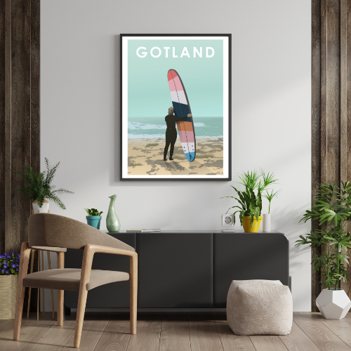 Upptäck skönheten och äventyret på Gotland med denna surfinspirerade poster. Motivet fångar känslan av frihet när du blickar ut över det glittrande havet med en surfbräda i handen – en påminnelse om öns unika kombination av stillhet och vild energi.